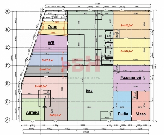 В ТЦ представлены магазины продуктов, рыбы, мяса, разливных напитков, аптека, ПВЗ.